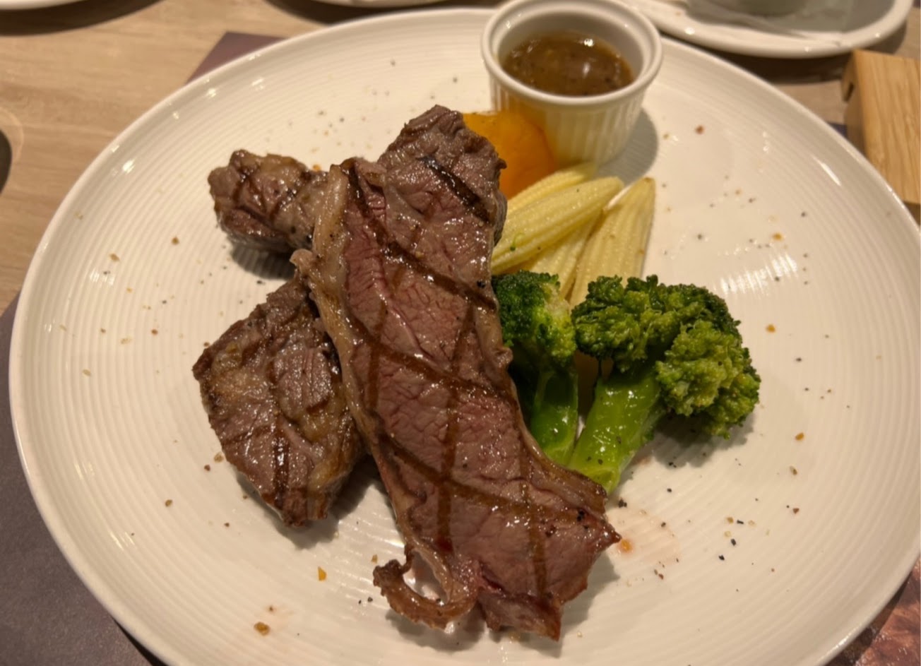 好吃!好吃!牛排的肉質、煎烤的熟度控制很不錯。除了主菜,可以免費持續取用的羅宋湯更是記憶亮點。如果能更好,排餐的花椰菜可以再更鮮綠新鮮感更好。