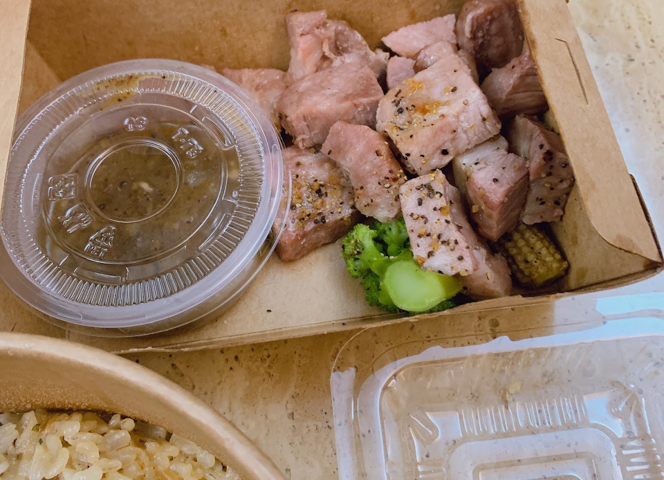 7/17 12:30外帶。前一晚先訂了美國雙倍板腱牛排,因為活動買一送三、又有豬排+燉飯+玉米濃湯。