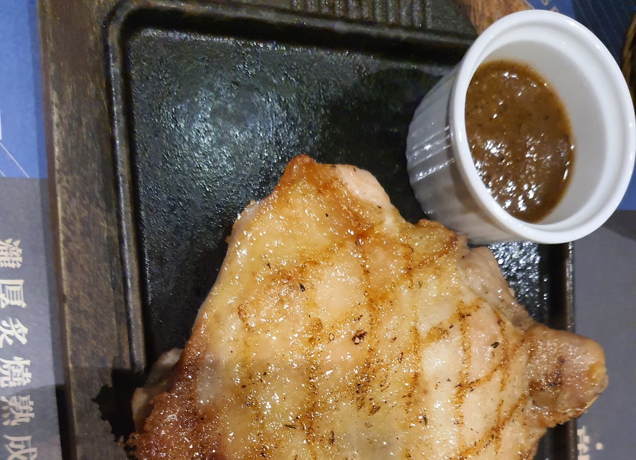 重頭戲來了,老饕菲力肉質軟嫩、肉汁甜,有驚艷到我,但最令我驚艷的卻是炭火雞腿排,顛覆我對於「雞腿排」的印象「油膩、乾柴」,那躺在吱吱作響鐵盤上的雞腿排看起來很「乾爽」,第一口吃下居然是「嫩的」,配菜部分也不差,沾醬也很棒!