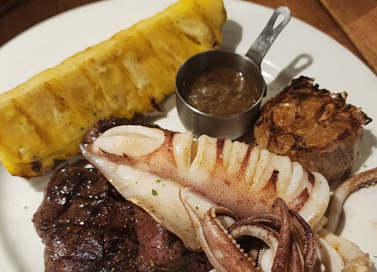 正餐選豬肋,不會乾材,BBQ烤肉醬紮實的裹住豬肋。配餐兩樣:很特別有烤鳳梨的選擇,正值鳳梨季節,烤得很剛好和蔬菜串,因為不敢吃洋蔥就先跳過,不過其他蔬菜烤得恰到好處。