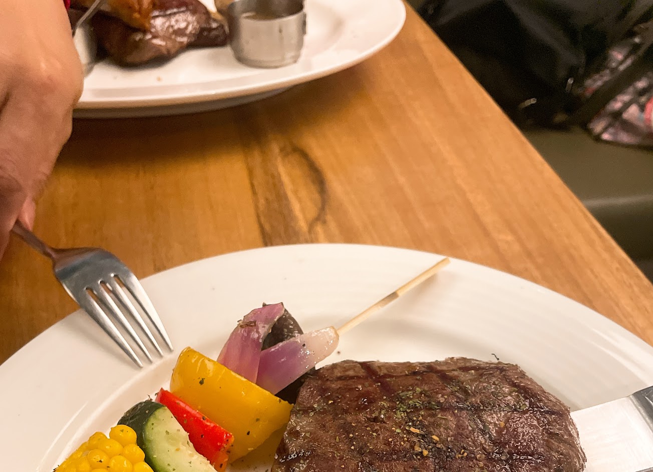 價格親民好吃,cp值高,套餐A+100就有湯跟飲料;B+190就多一項甜點,甜點超推必點蘋果派佐冰淇淋!為晚餐畫下完美句點!蘋果派現烤配上冰淇淋超好吃!飲料可以加價換其他選項,這次飲料選可樂很後悔,小小200cc的玻璃瓶裝,本來以為會是美式餐廳那種大杯裝⋯牛排有沙朗菲力翼板,食量大的可以雙拼雞腿或豬叻。配菜六選二,香料飯跟薯泥都是小小醬料碗的大小,想吃澱粉的可選玉米或薯條。