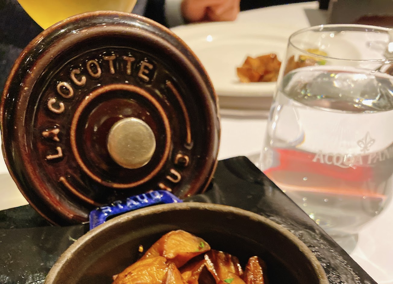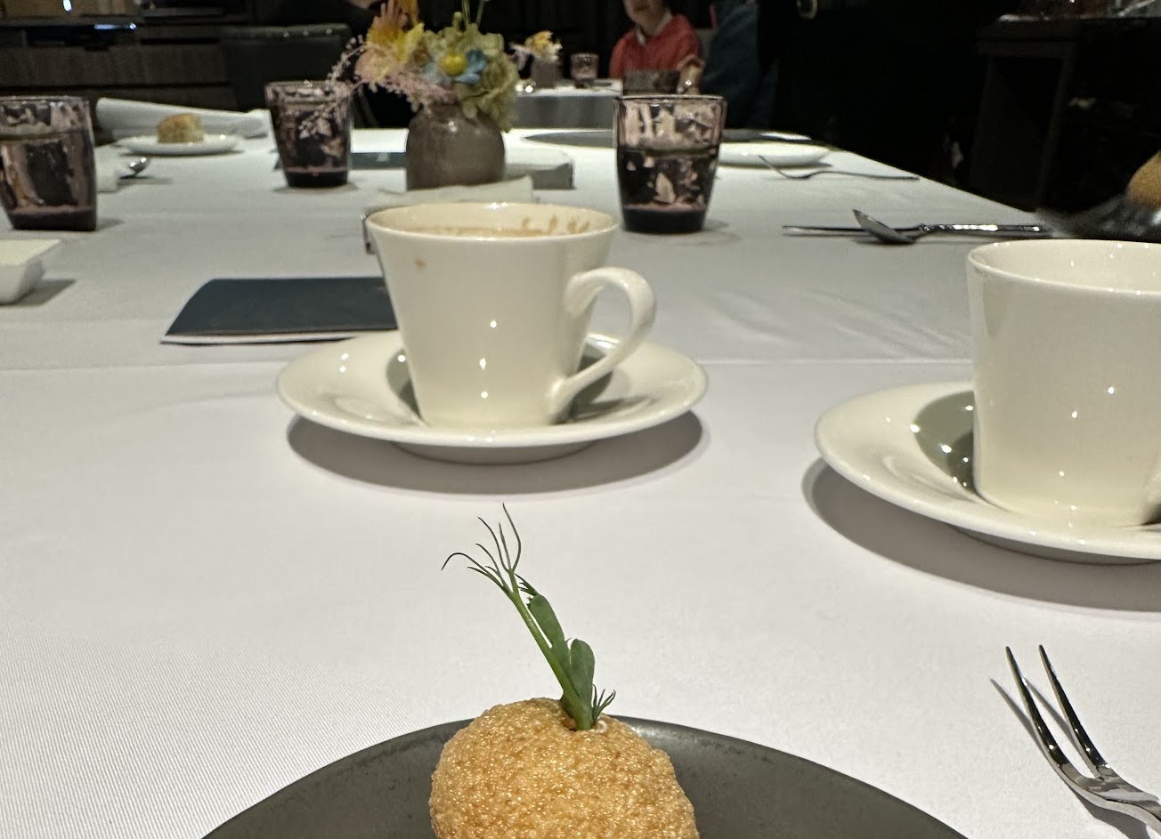 餐前麵包配松露奶油 秋蟹 下層有很特別的柑橘凍還不錯滿喜歡 和牛卷 味道較重但吃起來比較滿足? 鵝胸 皮酥肉嫩 好好吃! 牛舌 有兩種一個薄片捲酸白菜跟馬斯卡彭起司,另一串厚切的咬得有點辛苦 洋蔥湯真的好喝好喝好好喝????????