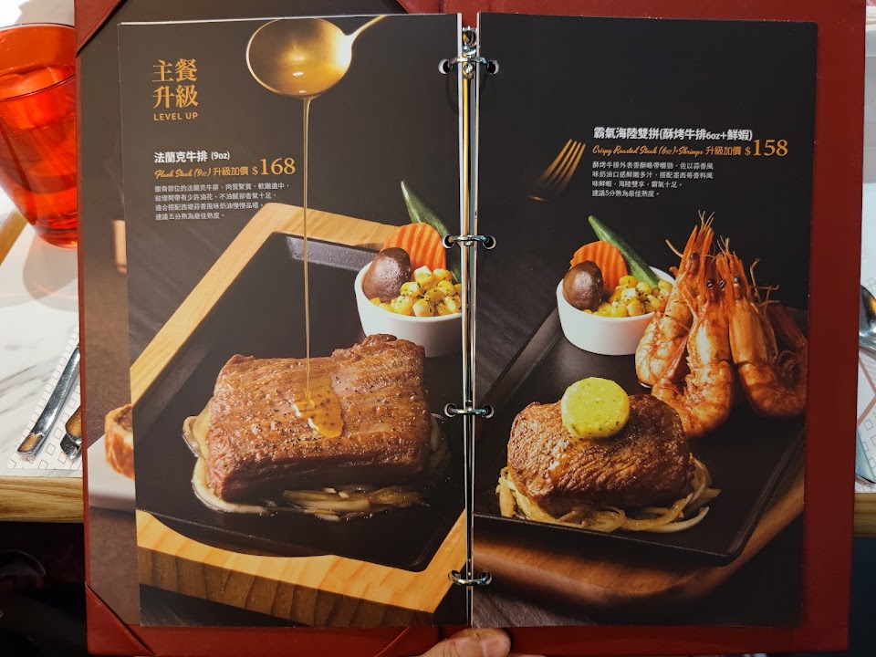 原塊牛排還是一樣經典好吃! 但每道菜的份量都越來越少,焗烤蘑菇只有兩三片蘑菇 餐點:4 服務:4 氣氛:4