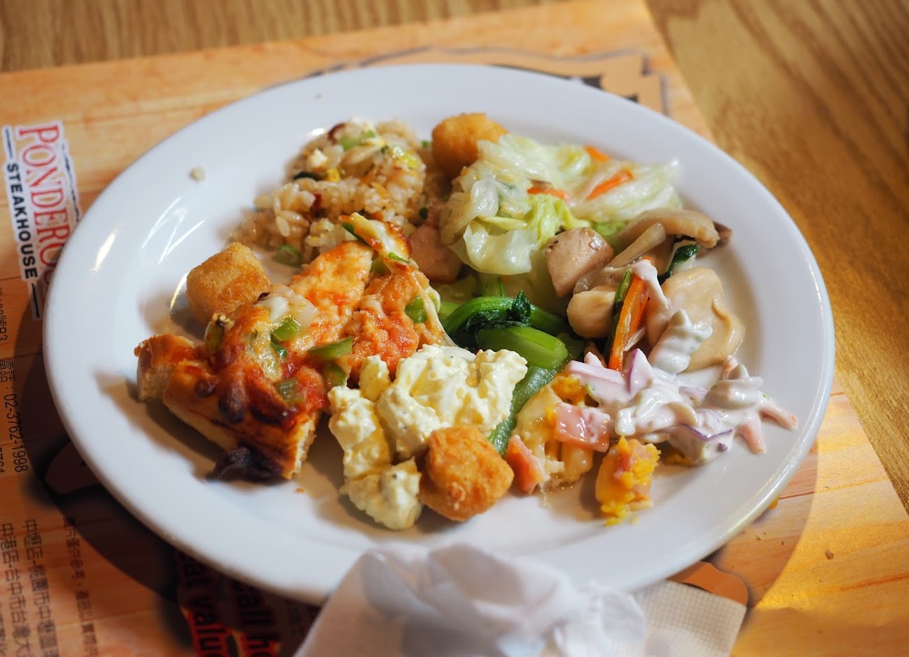 世界最大的牛排連鎖餐廳,排餐品質不錯,用烤網烤好的,送餐來非鐵盤,點了原塊7oz沙朗牛排和香烤雞腿排炸蝦,肉質軟嫩不柴,會附一顆奶油馬鈴薯,要趁熱吃,可以加一點鹽提味;生菜沙拉表現OK,水果也不錯,會有服務人員一直擺整齊;還有許多馬鈴薯泥類的涼拌或焗烤沙拉,熟食含炒飯、炒麵、義大利麵、烤雞肉,炸物為蝦餅、薯條、雞米花、麻糬捲;另外還有墨西哥脆餅和餅皮可以包一些肉醬、洋蔥、青椒烤肉等來吃,口味不錯;湯品有南瓜、洋蔥、玉米濃湯;甜點檸檬派好吃;冰淇淋和飲料表現普通。整體食物夠吃,價位視點的排餐而定,約400~700左右(+10%完),偶爾嘗試美式牛排館風格也是一種不同的體驗。但是一進門櫃檯處就要先站著點餐收費,比較沒有充分考慮的時間,建議事先看菜單選好。