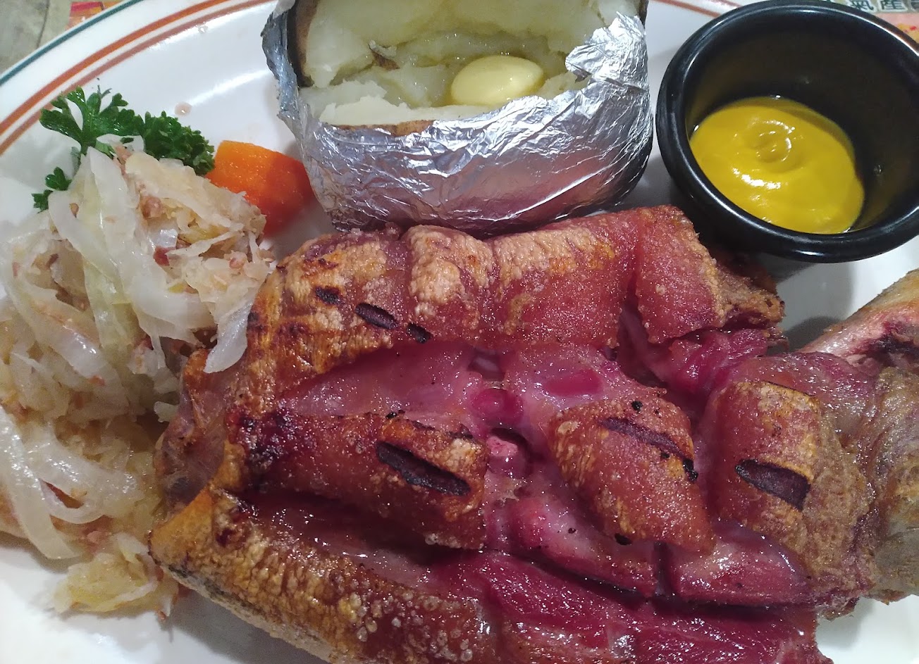 德國豬腳硬梆梆咬不動,自助配菜比主餐好吃。