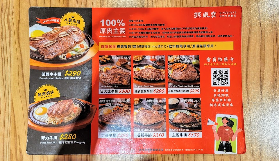 吃過了很多家的孫東寶,個人最推薦老饕跟板腱牛排!這家店的熟度及口感掌握的很不錯,環境也算舒適,可能是特別幸運,這次來給的肉好大塊?