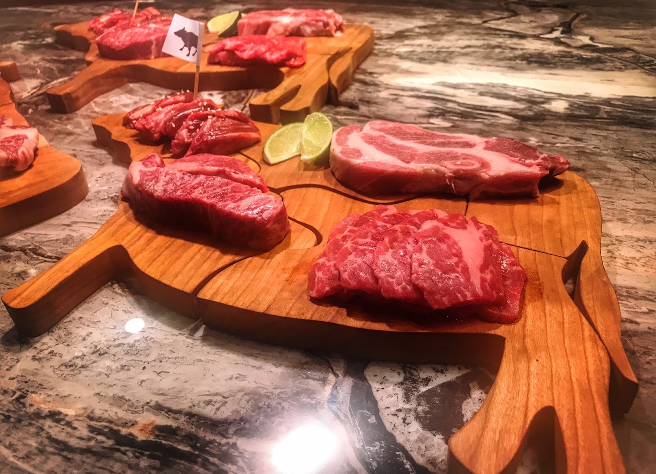 老闆有創意的讓整頭牛的部位排盤出來給客人有視覺上的刺激。牛舌很厚很好吃。我們點「自慢牛一頭盛合」套餐。價位偏高但是有專門服務跟美味的和牛食材。裝潢摩登跟燈光明亮。