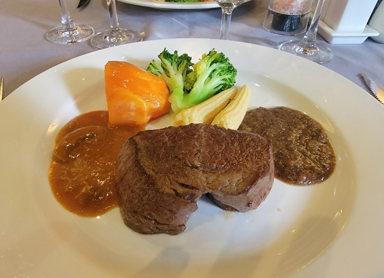 點了菲力牛和煎鮭魚排套餐。整體而言食物好吃,從前菜到最後的甜點,甚至是主餐的配菜也好吃。唯昨晚吃到的鮭魚有點柴,和服務員反應後店家也很快給予補償。會再來消費只是應該不會點魚?? …