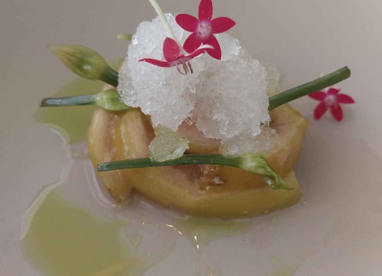 甜點非常厲害有三道,兩道有冰淇淋很爽口 第一道 薄片醃製蘋果佐牛奶冰淇淋,洋菜根醬. 第二道 南瓜新鮮做成泥搭配蛋白霜帶一點焦糖,還有磅蛋糕 最後搭配飲品有布朗尼香蕉醬,泡芙,草莓軟糖