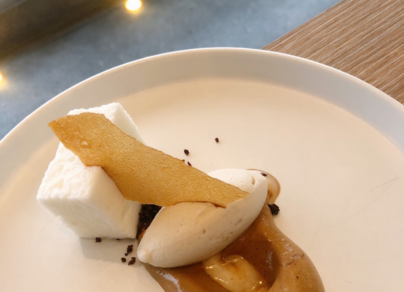 甜點是手打400次咖啡行成的奶泡佐牛奶凍,還有玉米脆片與巧克力與冰淇淋,整套餐收尾的好,有鹹甜與交錯,還有口感的脆與柔順,能感受北歐的秋季料理特色