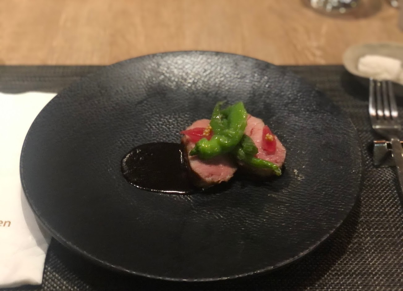 今晚我吃2180的餐,前三道的品質和味道的鋪陳,令人稱讚,但是吃到牛的胸腺,大打了折扣,因為胸腺是淋巴結,它不像牛肚那樣安全,若沒有高溫殺菌有危害健康之虞。有幾道深色的食材配上深色的餐盤,在視覺效果上就沒有那麼加分。不過服務品質很好。