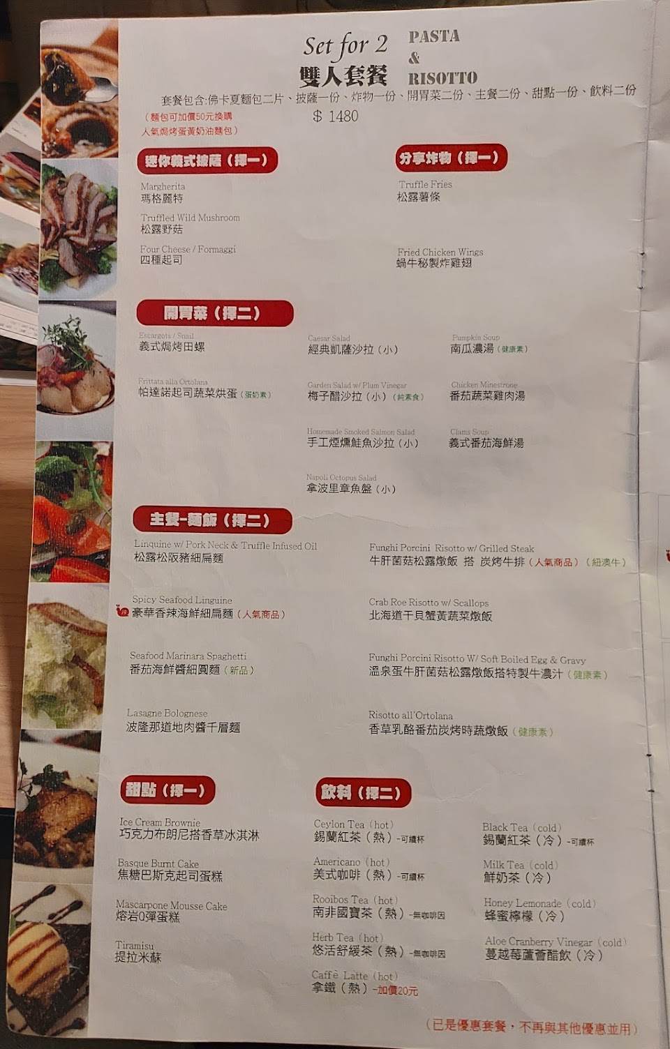 Menu的雙人套餐不到1600元,氣氛美口味佳,吃到很撐,很可以哦!下次一定還要再約朋友前來聚餐!
