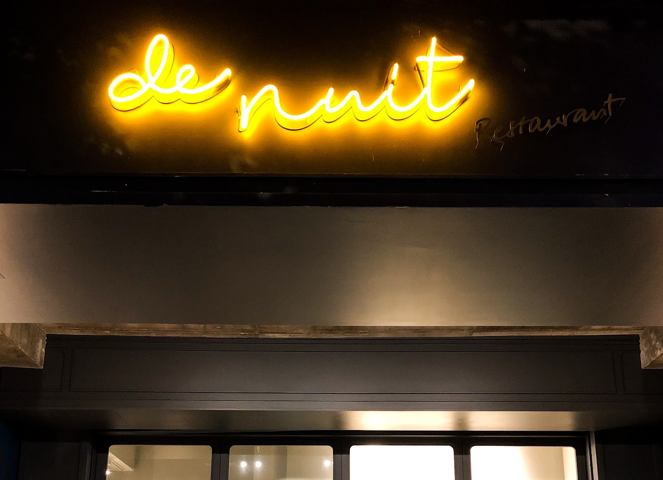 【de nuit 】重新裝潢,今年3月開始營運,不巧碰上肺炎災情。因為學長推薦,今天跟朋友聚餐就選定於此。外觀裝潢甚是有趣,有仿電梯裝飾條。內部空間算是有氣氛,空間座位不算多,服務人員略嫌不足一點。晚餐只有一種套餐,間雜著一些額外加點的菜色。