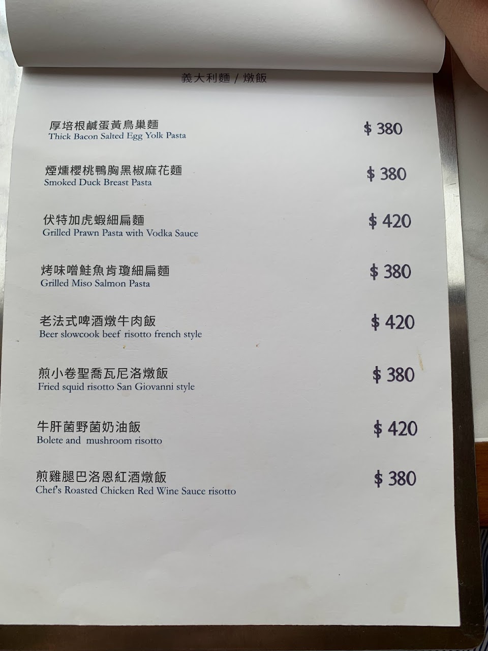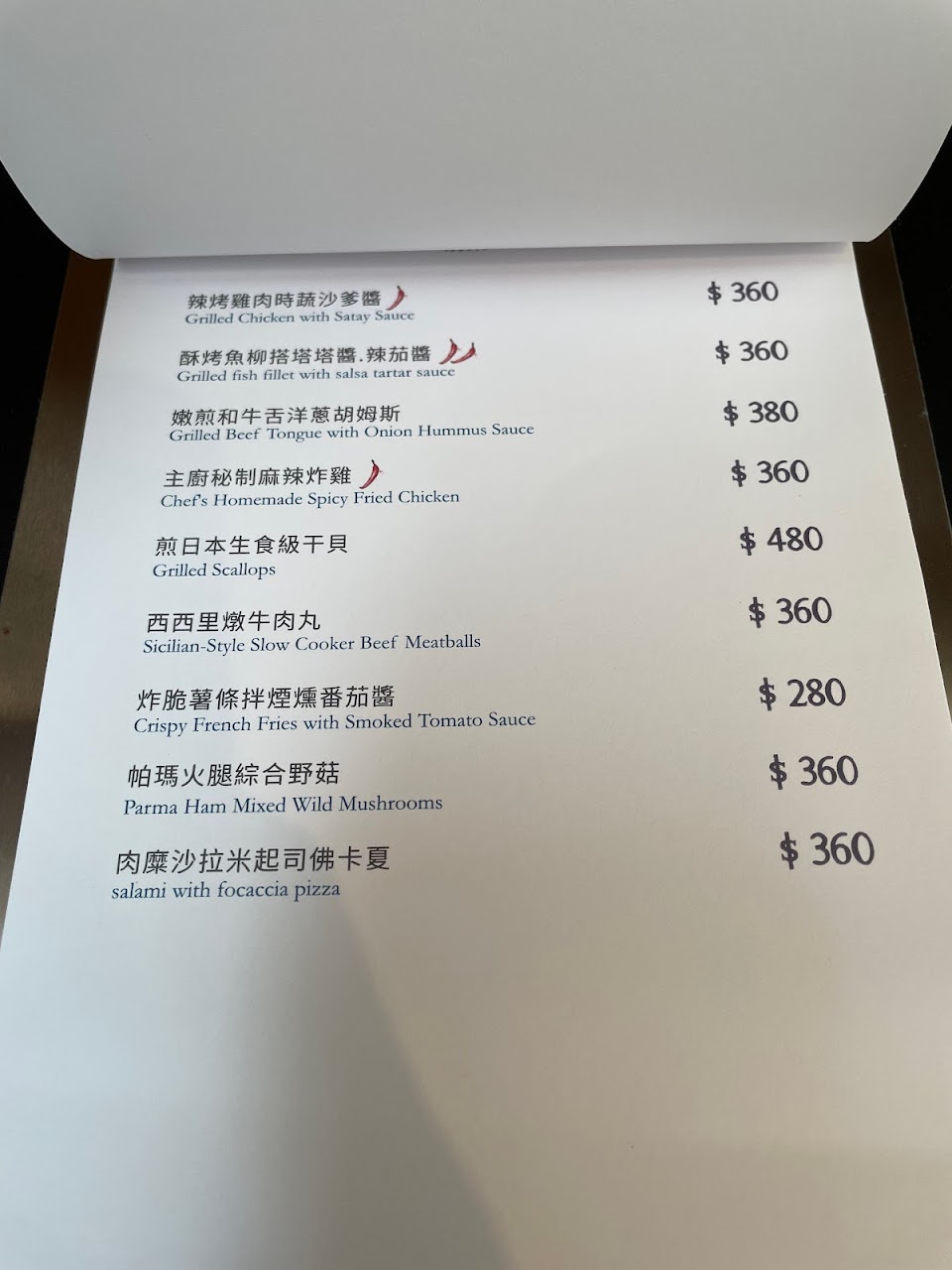為了採光把戶外院子蓋透明天花板,但夏天就很熱,若能選位置,盡量靠近內門口;幸好我們位置旁邊有電扇不然真的熱死。店員都在室內吹冷氣,但室內沒啥客人,客人都被安排在院子這區,桌數較多,要叫店員要有耐心。雖說是餐酒館但酒單都是整支賣的,沒有單杯賣,很可惜。餐點覺得被招待的烤布蕾最好吃?