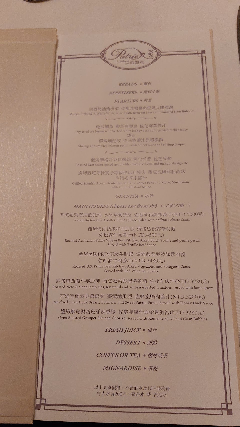 每年生日前後都會選一家餐廳來犒賞自己。 今年很開心可以到派翠克用餐, 前菜從食材的搭配烹調的方式 到對客人過敏食材的避免,都很細心的安排。 每一個入口的料理,都讓我忍不住閉上眼睛慢慢品味。對廚師的巧思感到敬佩。 感謝廚師及服務人員的用心,很滿意的用餐經驗。