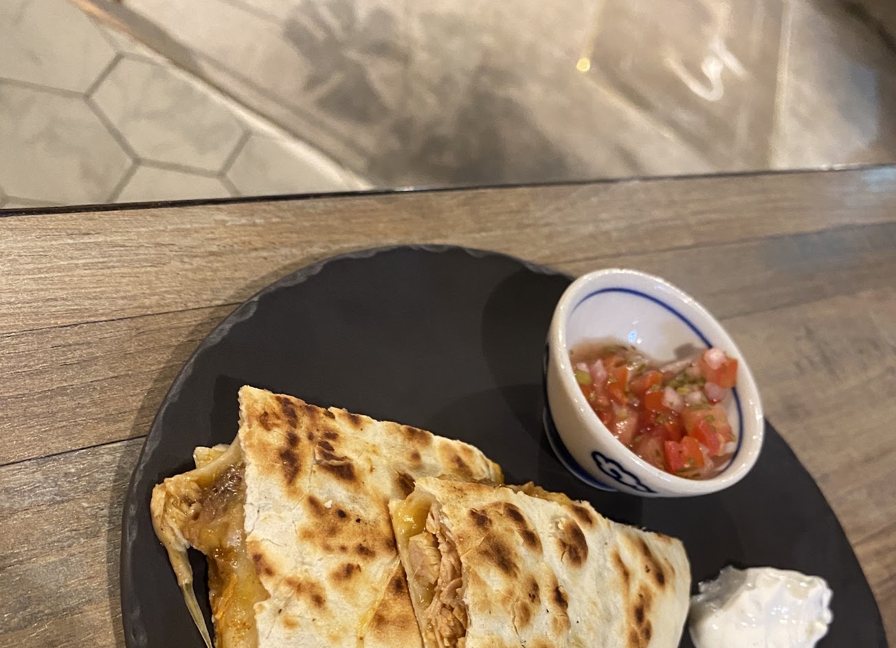 ?️ 手撕豬起司烤餅 手撕豬肉口感嫩搭配起士濃郁香氣,相當好吃!一旁還附有沙沙醬、酸奶等,增添不同風味。