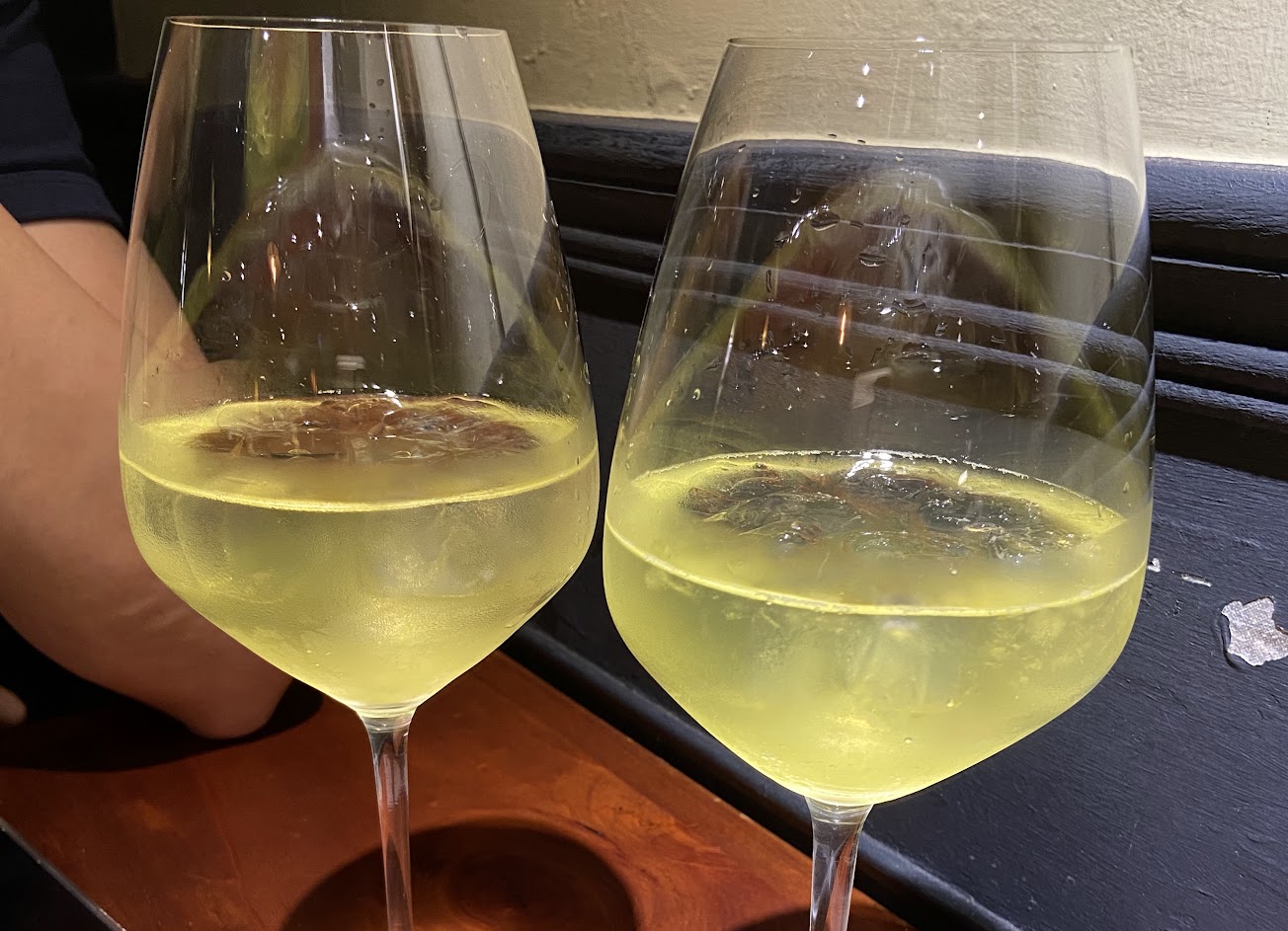服務生在桌角倒好酒,再把杯子擺斜斜的、伸長了手遞給我(傻眼),另一次她跑來桌邊倒酒,瓶身的水滴滴到我褲子上。