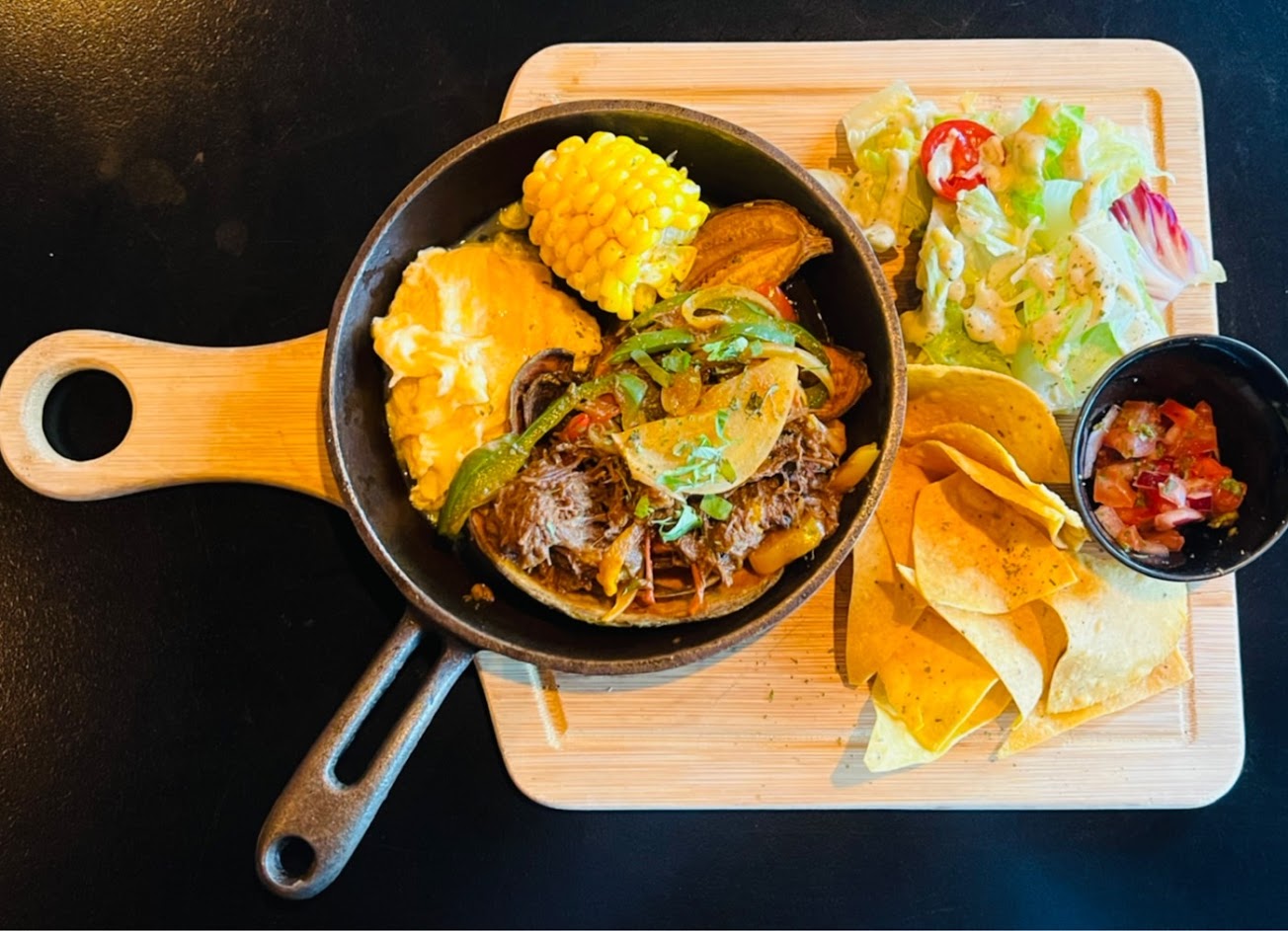 想找有早午餐的餐廳,意外看到這個,第一次吃這類型的料理,黑豆燉肉風味很特別,但很好吃,有香料燉煮的味道,搭配炒蛋也很合適,還有玉米脆片配莎莎醬,非常清爽(平常不吃番茄),搭配起來不會覺得口味重,當下大概2、3組客人,等餐時間大約20分鐘,服務也挺不錯。