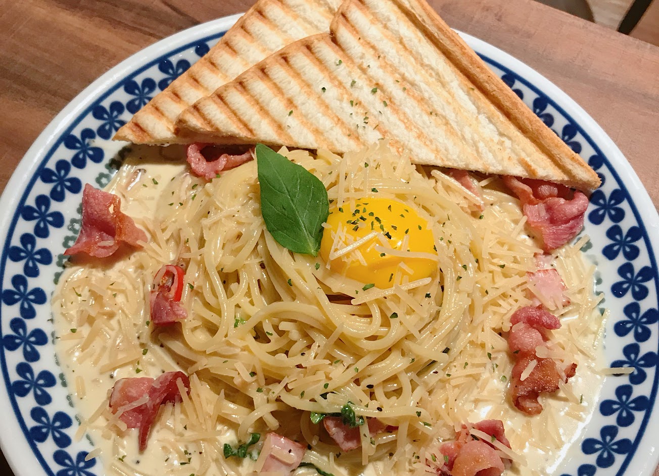 五星等級奶油培根義大利麵??&外面很難找到的拖鞋麵包料理?