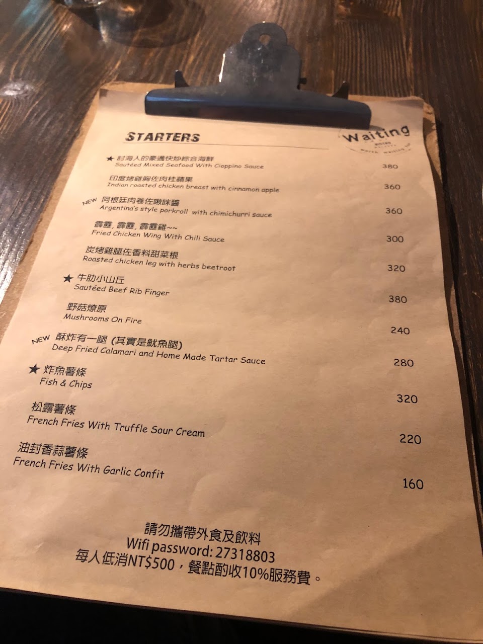 Waiting Bister在市民高架酒吧熱炒滿滿的附近,有室內外的用餐場地 ,雖然在舊社區內,但裝潢的很舒適,讓人感到輕鬆的感覺,比較偏向啤酒運動酒吧,各式各樣不同風味的啤酒,可以跟店員說喜歡的風味,店員會熱情的幫你推薦,除了有眾多啤酒可以選擇,還有餐點可以用,奶油蛋黃麵,那麵香搭配蛋黃,鹹甜鹹甜,非常滑順順口,松露豬燉飯,很精緻香氣非凡,口感不錯,但蠻吃個人感覺,炸魚薯條,整條魚條吃起來很爽,非常適合配酒,整條感覺是個輕鬆好吃的餐酒館。