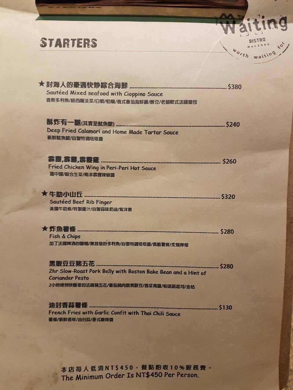 空間狹小 餐點選擇不多 高單價 高低消每人500 但食物的美味不成正比 我們點了牛肋小山丘 是道無趣的餐點 海鮮拼盤和fish and chips料很少 啤酒定價偏高