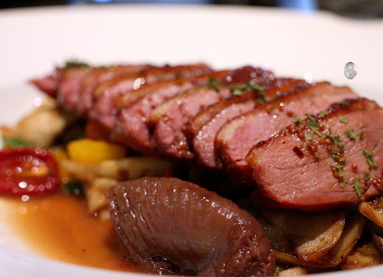 片片櫻桃鴨胸呈現柔軟的棗紅,洋洋灑灑躺在馥郁甜酸的蔬菜上,淋上一抹濃稠柔滑,紅酒、無花果、肉桂、巴薩米克醋等食材滋味相融,果香濃郁,卻是不甜膩的曼妙。鴨胸微帶煙燻香,表皮彈爽不肥、肌理細緻不韌,薄切仍不減風味,好個優雅