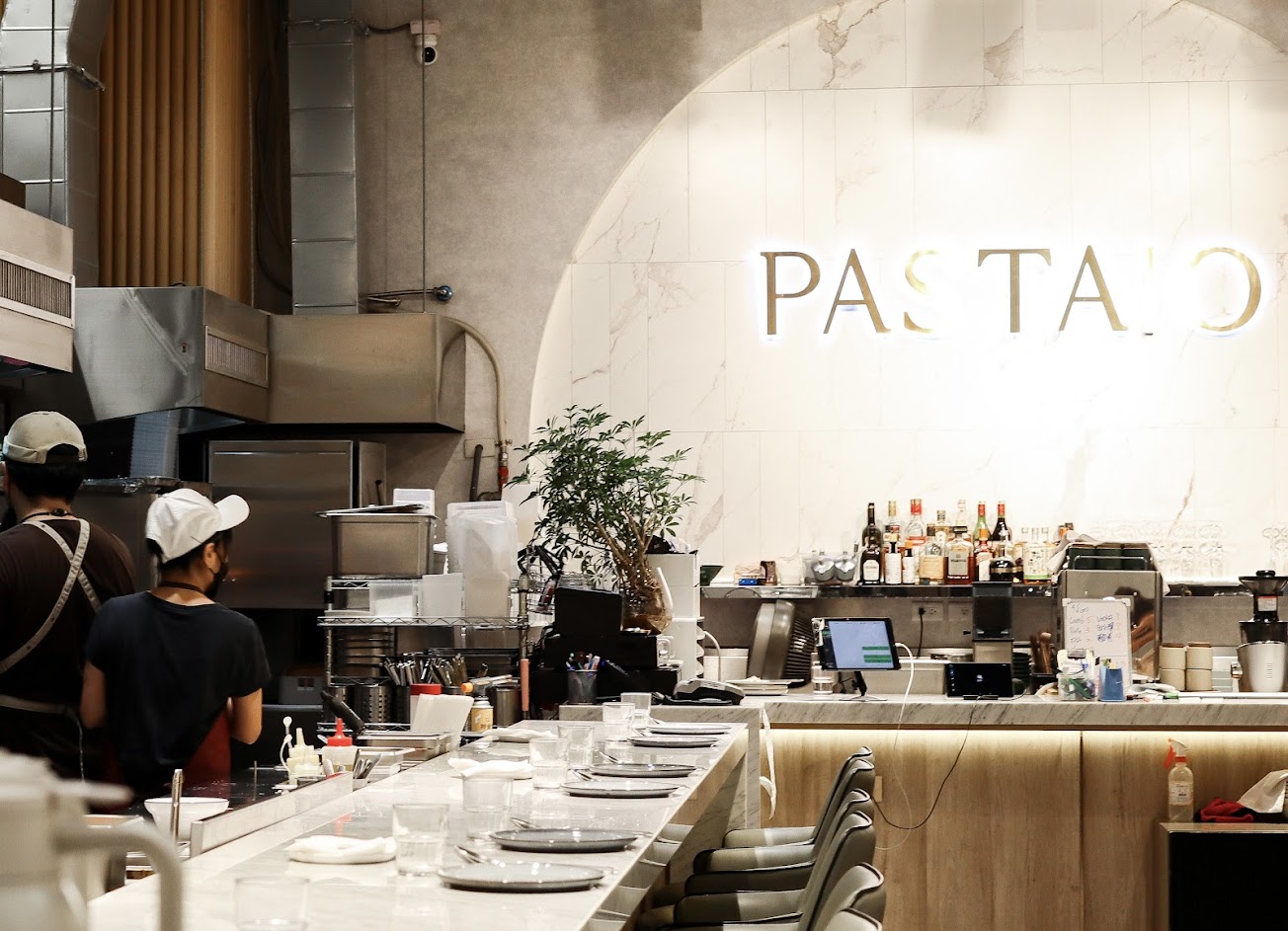 供應自製義大利麵餐點的時髦餐廳,天花板採挑高設計且裝潢十分現代化。