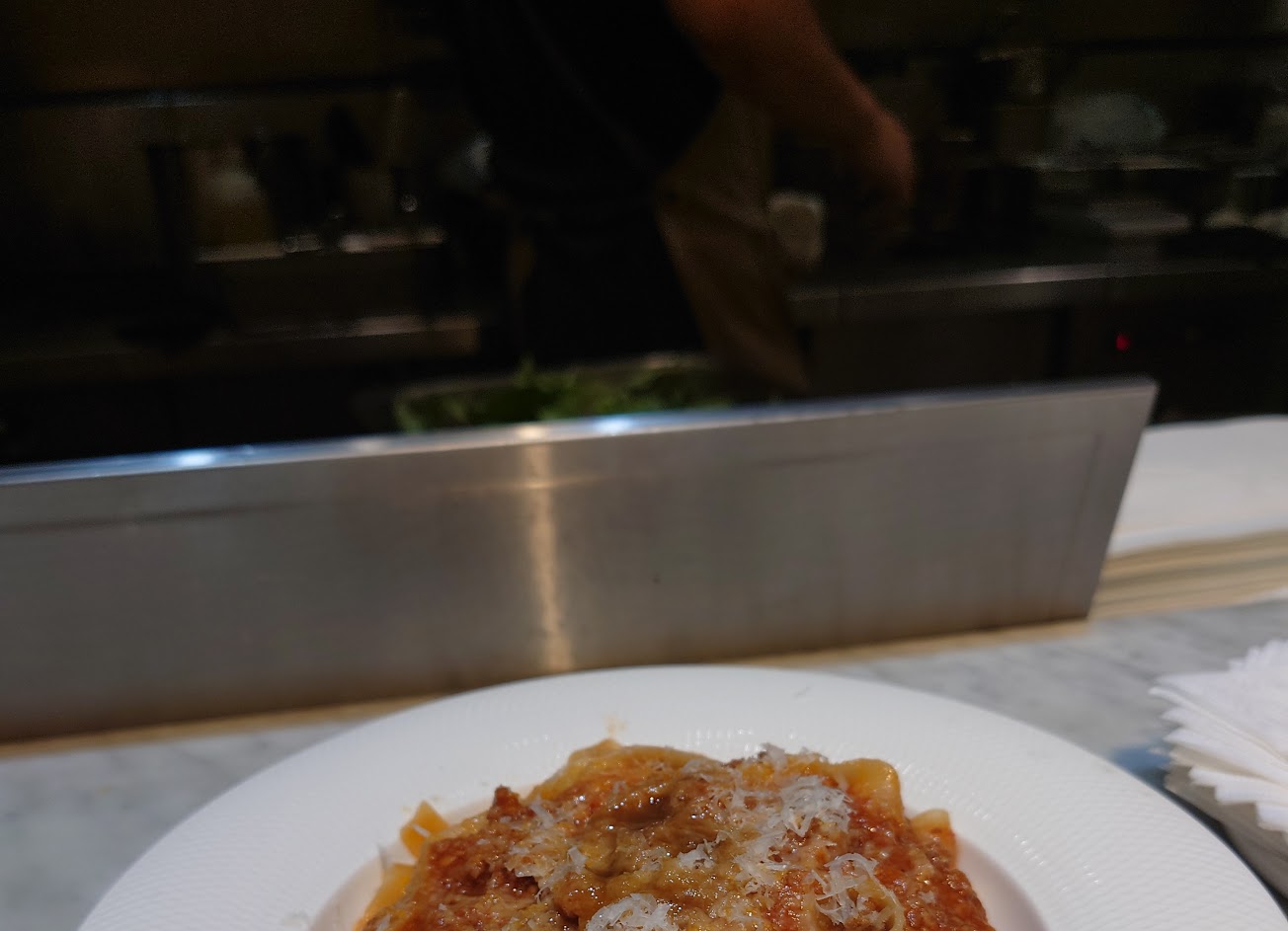 和朋友一起來試試看,因為沒有預約,加上是兩個人,所以就坐在吧檯的位子,服務員還會很貼心的協助調整高腳椅,服務很好!吧檯的位子可以欣賞烹飪料理過程,但也有缺點就是有點熱,尤其我們在爐火那塊區域,熱氣還是會過來,但不至於難過,就是可能會覺得有點小熱。餐點都是單點,我們點了一份溫沙拉、肉醬麵跟青醬的貝殼麵,沙拉很不錯,調味跟甜菜根都很搭!但主餐的部分,肉醬麵就是正常,我自己是覺得有些稍稍太鹹,但大致還不錯,不過青醬貝殼麵的部分,我們是覺得有點小可惜,雖然服務人員有貼心的提前告知會有點偏硬,但吃起來的口感,我自己是覺得比較有點像是沒有熟透的口感,因為部分的貝殼麵很Q彈,部分的有這種感覺,才會出現有似乎沒熟透的感覺(個人主觀印象),但青醬調味的很香,還有保留松子增加口感。整體而言,用餐環境非常舒適,服務態度、環境都很不錯!