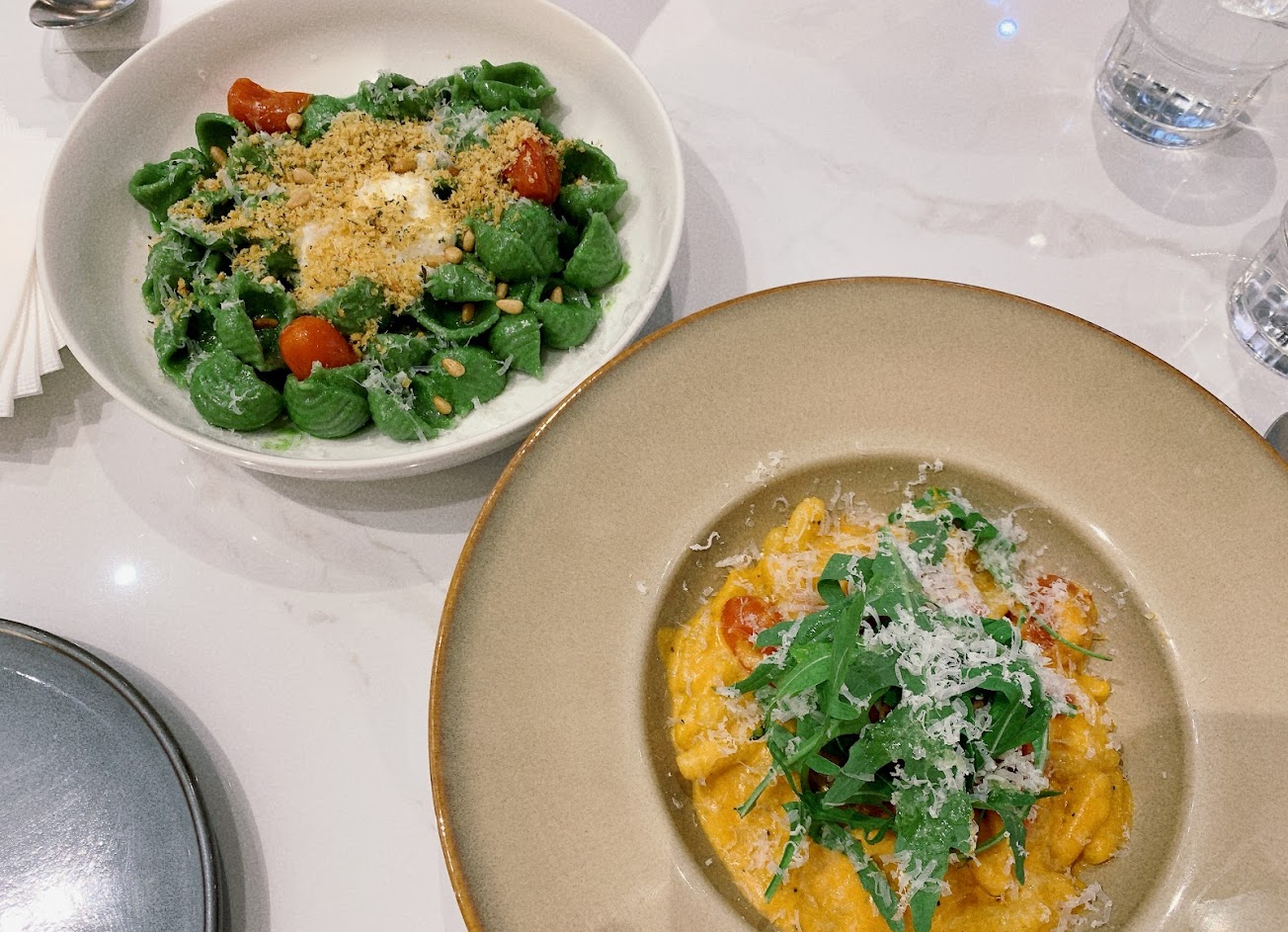 供應自製義大利麵餐點的時髦餐廳,天花板採挑高設計且裝潢十分現代化。