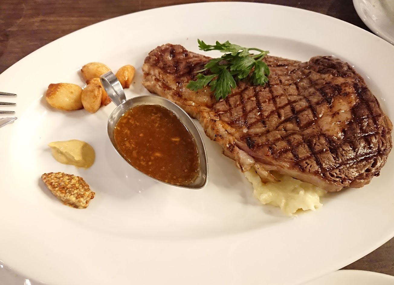 牛排需要更保持溫度的餐具, 而不只是放在薯泥上. 其餘部分都很優秀