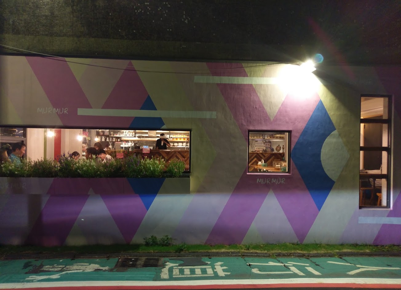 外牆面的轉角處連成一線的呈現現代彩繪風格,由不同的色塊組成,在這裡可以盡情的拍出與眾不同的照片,絕對會是新的網美打卡點!室內是溫暖的木質調風格,還有Mur-mur牆面,選用義大利國旗的配色,相當可愛。晚間用餐時間七點半座無虛席,下班後可以約在這裡跟好友Mur-mur話家常。