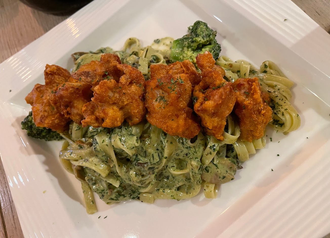 麵量很大,青醬洋菇炸雞義大利麵,不管是麵量或是炸雞量都很夠,而且炸雞多汁CP很高。