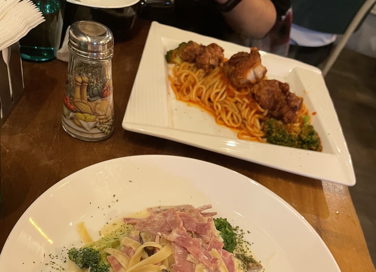 推薦點, 麵量很大,青醬洋菇炸雞義大利麵,不管是麵量或是炸雞量都很夠,而且炸雞多汁CP很高。 白醬酸豆煙燻鮭魚,料給的很實在,CP也算高。