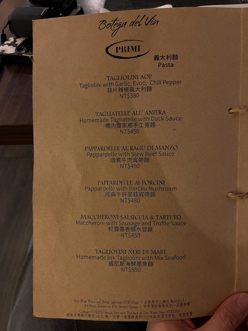 ?Botega del vin 入座後先問要一般開水還是氣泡水,之後上麵包和橄欖油沾醬,完全跟義大利的餐廳一樣。在義大利時是一人1歐元,這邊是一人50NTD的茶水麵包費。