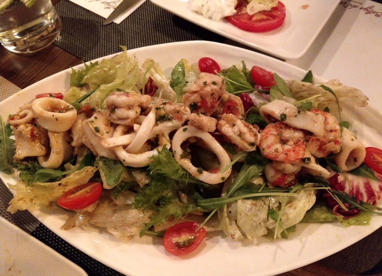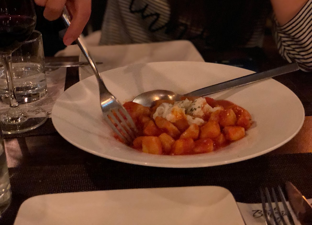 從外面看是一間布置得很有氣氛的餐廳,但是餐廳內坐位非常擁擠,走路都覺得不小心會碰到兩旁的人,此外大家聊天的聲音也感覺非常吵雜。兩個人用餐點了蒜香辣椒義大利麵以及起司麵疙瘩,再加點烤蔬菜以及提拉米蘇。蒜香辣椒義大利麵的麵體有點硬,而且也不夠入味。起司麵疙瘩沒有任何配菜,吃起來蠻膩的,烤蔬菜份量倒是不少,食物本身還蠻美味。最後份量有點過多,因為是第一次用餐也不曉得份量,以這樣的價位,服務生知道我們是第一次去時,應該是可以在點餐時給我們建議….。