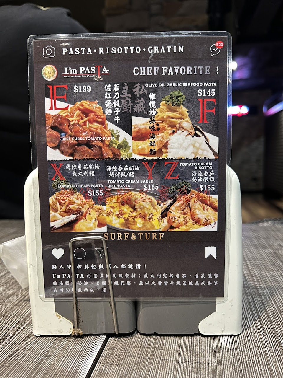 先不說這麼大間 為什麼沒發票,還有服務生之禮儀 擦手指盤子都水 等等的,我只說我點的墨魚麵,你們家的用墨魚汁做醬汁炒 很不錯,但為什麼完全沒有墨魚汁的味道….我第一口墨魚麵 味道只有一個 只有”辣“味,我不曉得我是不是點到辣味口味的墨魚麵了….後續吃 說實在我很仔細品嚐味道,味道真的我吃不出來,只有微微鹹味,花枝也沒什麼味道,墨魚汁完全沒有巴在麵體上,油不夠和火候,因為你們炒很乾了,後來我只好加起司粉吃了…. 如果炒成這樣,我是覺得不如直接用加工好的黑麵體,我覺得你們可以更好的,這是我的心得感想,你們一定可以很不錯的。