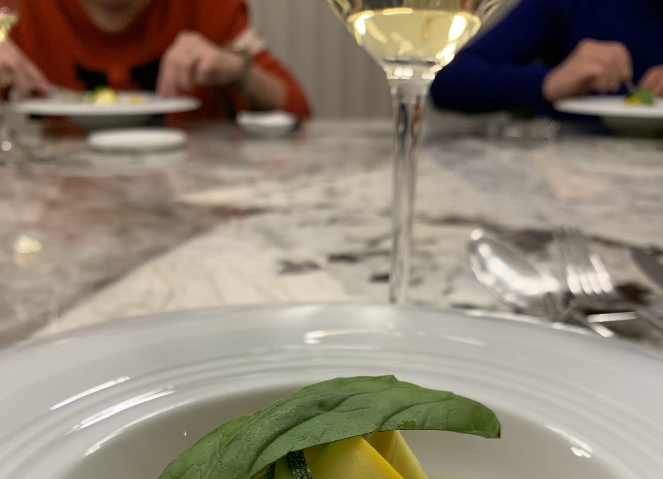 前菜菊芋這道口味並不明顯,吃完沒有開胃想趕快吃到下一道的提味,海膽麵雖然麵體都有包覆海膽的味道,但覺得收汁到過乾,麵的份量不多吃到中段後覺得麵很乾,海膽有一些些腥味,鮮魚櫛瓜這道的味道有點奇怪,整體沒有櫛瓜跟魚跟湯的融合感,好像就是洽巧放在同一個盤子裡(?)有搭酒,每道的酒產地跟搭配的餐說明很詳細