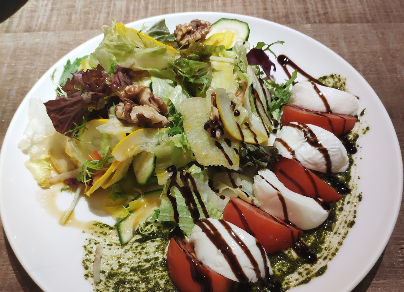 好吃美味的義大利薄皮披薩,海陸總匯跟帕瑪芝麻葉都非常好吃,推薦要淋辣油,可以提升香味但不會太辣。番茄奶酪沙拉裡有青醬跟甜甜酸酸的黑醋,清爽好吃。飯後甜點是淋上太妃糖醬的奶酪,很甜但很好吃。唯一的缺點是南瓜湯有點太鹹了,其他都很美味~
