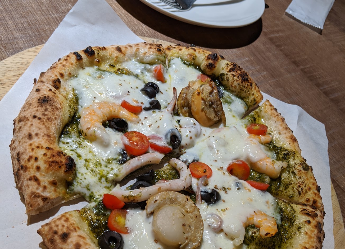 這裡12吋披薩可以選擇兩種口味的雙拼,但是餅皮當然就只能是一種(那不勒斯、羅馬、台灣小麥)。因為生日招待的披薩是9吋只有傳統的那不勒斯可以選,所以雙拼披薩就搭配了台灣小麥。餅皮部份台灣小麥使用的是喜願小麥的全麥麵粉,做法上則是和羅馬餅皮一模一樣用擀的,口感薄脆。這裡的傳統拿坡里用的是水牛乳的莫札瑞拉起士。但不知為什麼沒有那麼明顯的香氣(在Gino那吃到的就很很香)。紅醬的比例大於莫札瑞拉起士的感覺,所以味道和香氣的平衡都偏向番茄,有點沒有兼顧到的感覺。青醬海鮮部分配料有蝦、小卷、帆立貝,口味上是好吃的,不會覺得有什麼要挑剔的部分。但是切披薩的時候切的不是太好,沒有完全按照兩種口味的邊界切,導致兩片傳統拿坡里的邊邊沾上青醬,味道全被青醬蓋掉了。