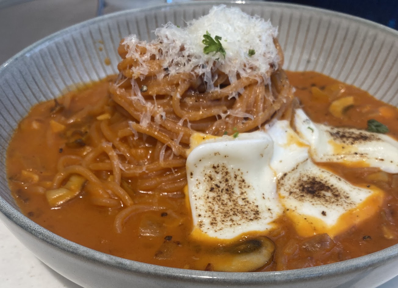 這位番茄酸滿高調的 麵體一如往常的有嚼勁 還有炸洋蔥 洋菇 堅果 洋蔥塊 層次感挺好