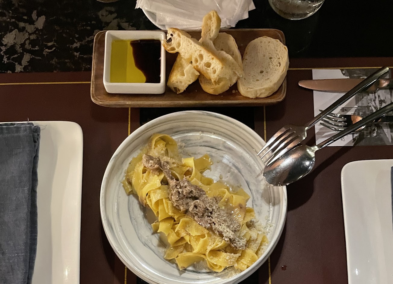 這次用餐老闆看我們是約會,贈送香檳兩杯,選的香檳配上餐點非常對味; 前菜點了一份火腿芝麻葉沙拉,份量稍小若考慮cp值應該選擇別樣, 南瓜松露濃湯,濃純順口兩人點一杯剛剛好。主食:1.燉煮斑鳩寬麵,這家的麵是自家手工,值得一試,調味口味濃厚配酒很棒;2.鴨肝燉飯,如果鴨肝味道太重,吃不習慣,喜歡重口味可以試試。