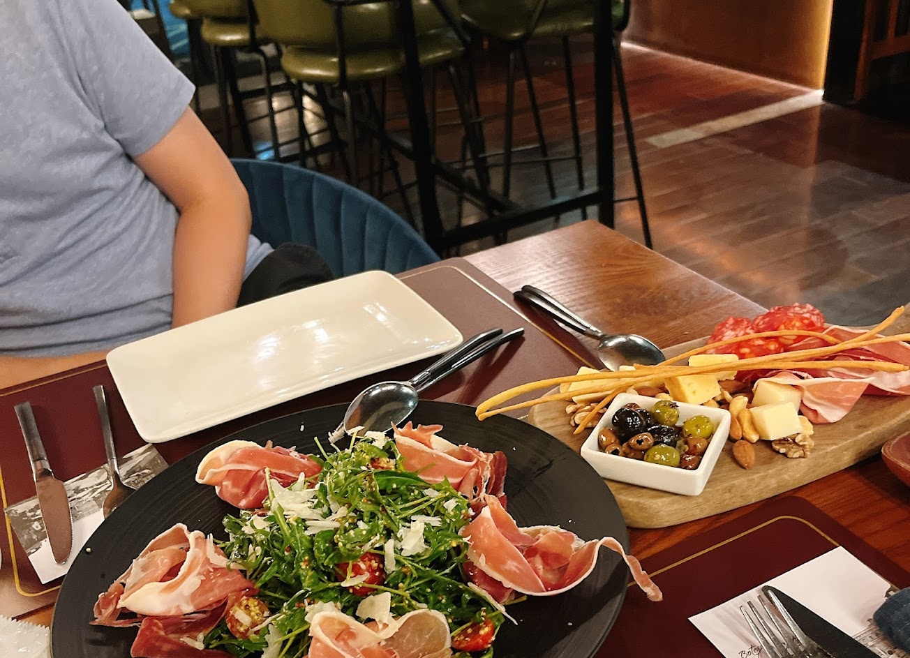 當天點雙人炭烤套餐,前菜的起司沾的紅醬味道還好,蕃茄味偏淡,上面有灑一些像巧克力碎餅的東西有點奇怪。 巧巴達麵包附的橄欖油醋醬太少,很難沾到。 火腿起司拼盤的堅果有油耗味,火腿是屬於軟嫩的,個人喜歡有嚼勁油脂香更濃烈的火腿。 義大利麵是偏硬的,醬汁濃稠包裹在麵上吃起來很香很喜歡。 主菜的部分則是相對讓人失望的,在義大利餐廳吃起穀飼和牛就不是那麼道地,尤其是斜切更是破壞肌肉的口感,吃起來偏柴。伊比利豬的煙燻味感覺是有特別醃漬加工過的味道⋯吃起來氣味一直黏在嘴裡散不掉⋯ 羊排是好吃的,鮮嫩多汁。 旁邊的馬鈴薯浸潤在油脂中烘烤,Q軟適中焦香四溢。