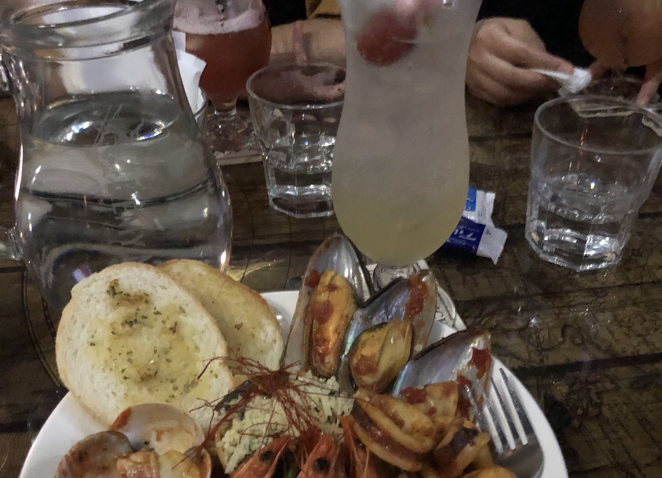 奶油鮭魚義大利麵跟野菇燉飯都很好吃,味道濃郁,飯跟麵都不會太爛,但青醬義大利麵太鹹了,吃兩口就無法再吃。燉飯跟義大利麵份量不會太多,吃一盤也不會太飽,能再喝兩杯調酒。