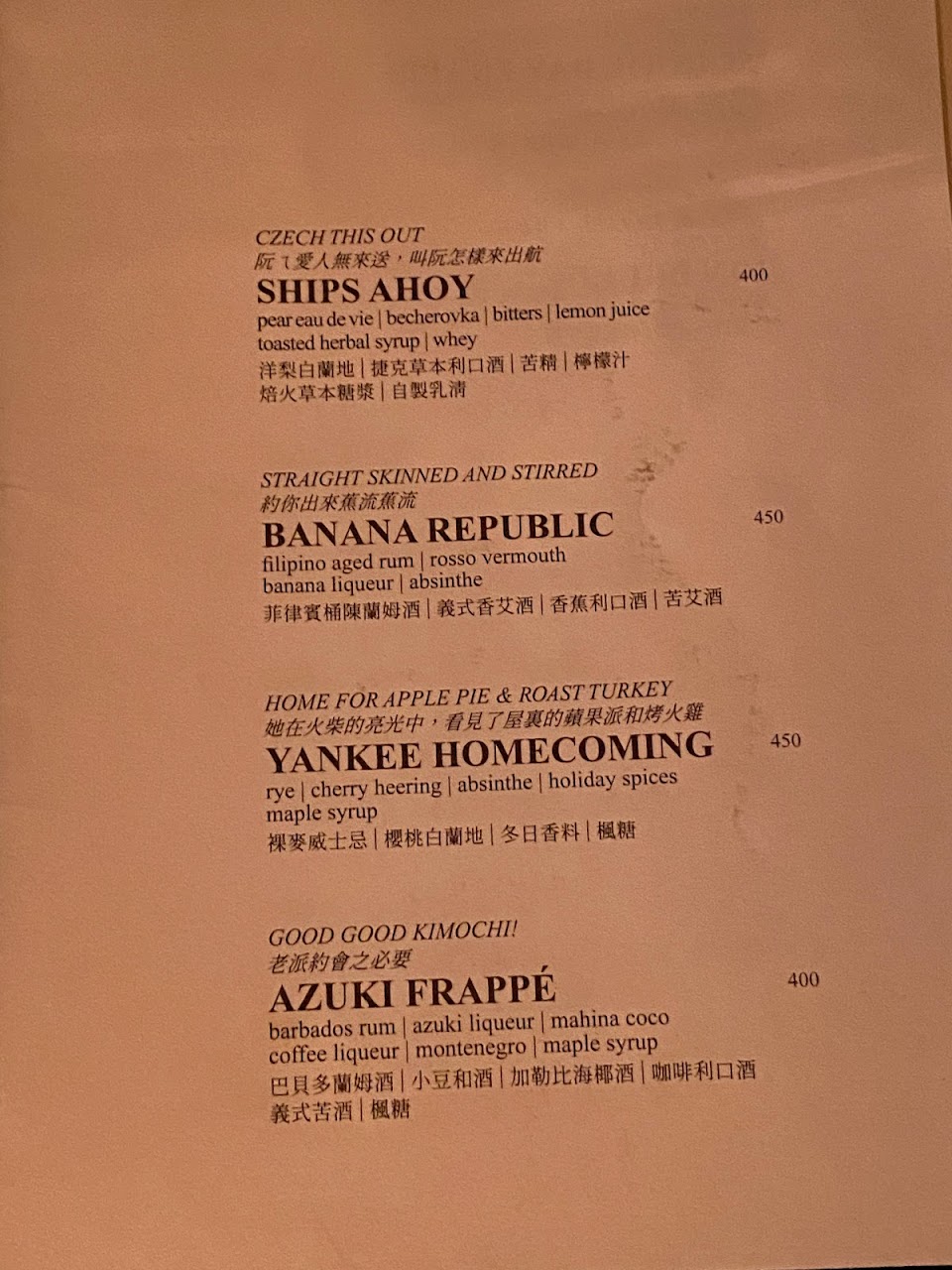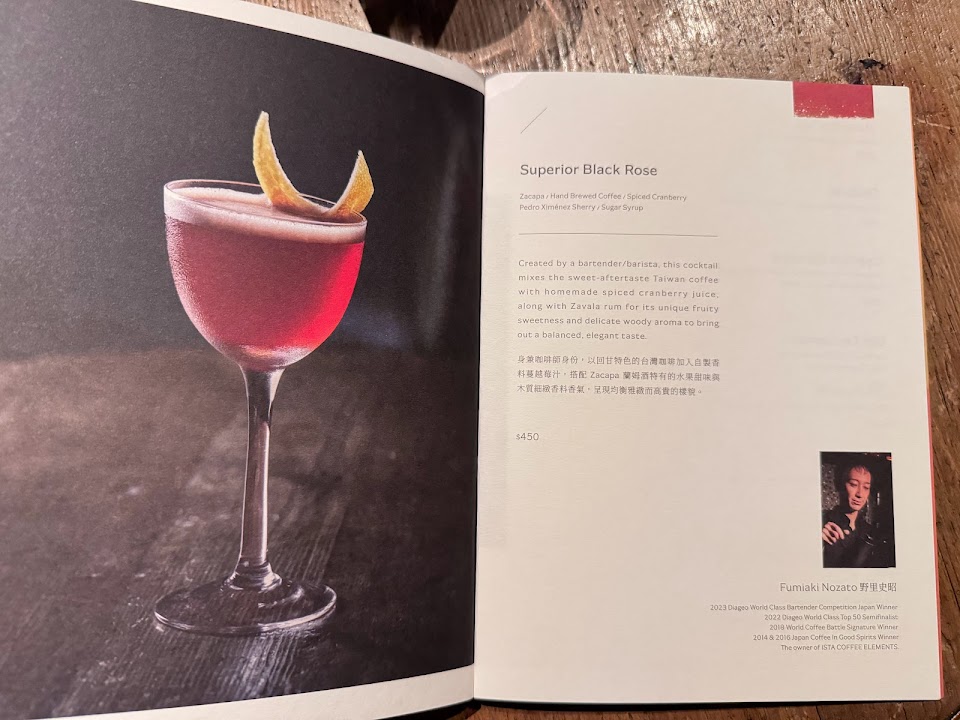 第一杯後,有跟Bar tender討論想要的口味跟感覺,獲得了兩杯菜單上沒有的特調!不管是在口味或是服務都無可挑剔!
