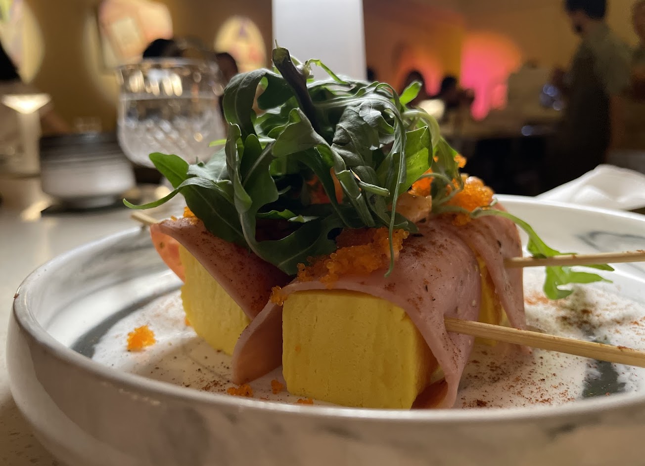 3.日式玉子燒伴燻火腿(開胃菜推薦) 『超級Q彈』的玉子燒搭上滿滿的蝦卵與火腿,上方生菜為芝麻葉,撒上七味粉,開胃菜必點視覺與味覺上的高級享受。