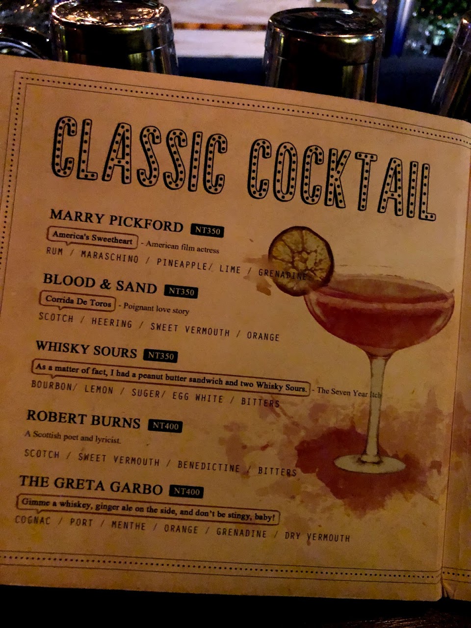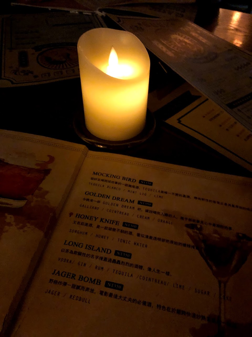 今天點的四杯調酒都很好喝!第一二杯是睡吧和秋香的樣子(有點忘記),睡吧的奶味非常適中不會膩,還可以搭配牛奶糖喝?秋香茶香味也很棒!但我個人覺得有一點點偏甜~後面點的長島冰茶跟內格羅尼蠻好喝的茶香很特別~ …