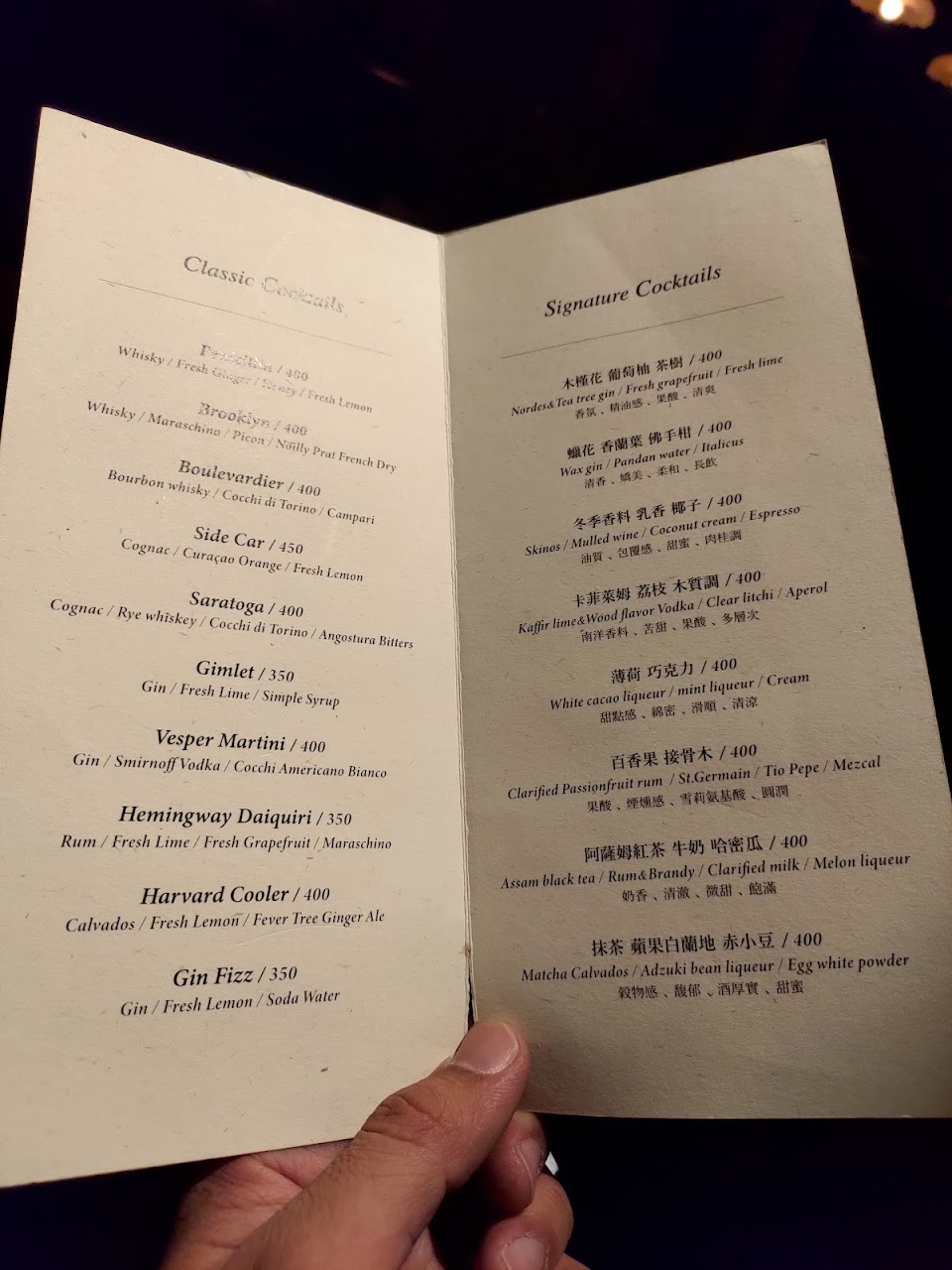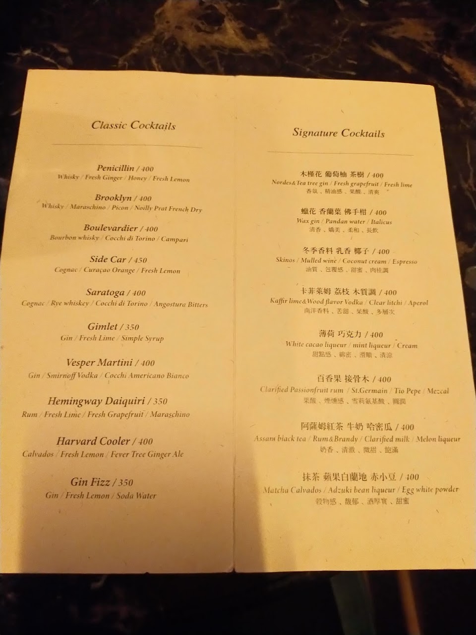 曾經拜訪過一次,時間在平日夜晚7、8點左右,點了一杯French 75。當時調酒師試飲向吧備示意香檳該換新的但是似乎沒有庫存,因此調酒師使用品質不夠好的香檳製作這杯調酒並提供給客人,其實坐在吧檯觀察是很明顯的,希望不要把客人當成外行人而提供不夠完美的調酒。