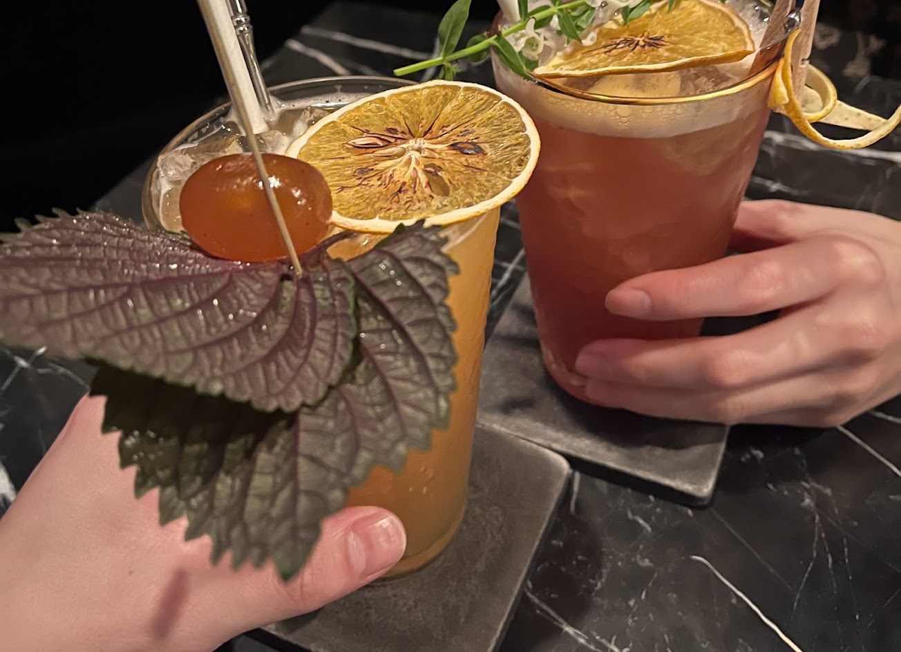 用高粱為基底的等我分手,梅子火秀帶出酸梅味,喝起來酸甜淡化了高粱的刺激;用琴酒為基底的萬人空巷,燃燒的柳橙跟喝起來的柳橙味互相呼應,紫蘇和金桔的香氣起到點綴的作用,推薦!(金桔蜜餞酸甜非常適合收尾)