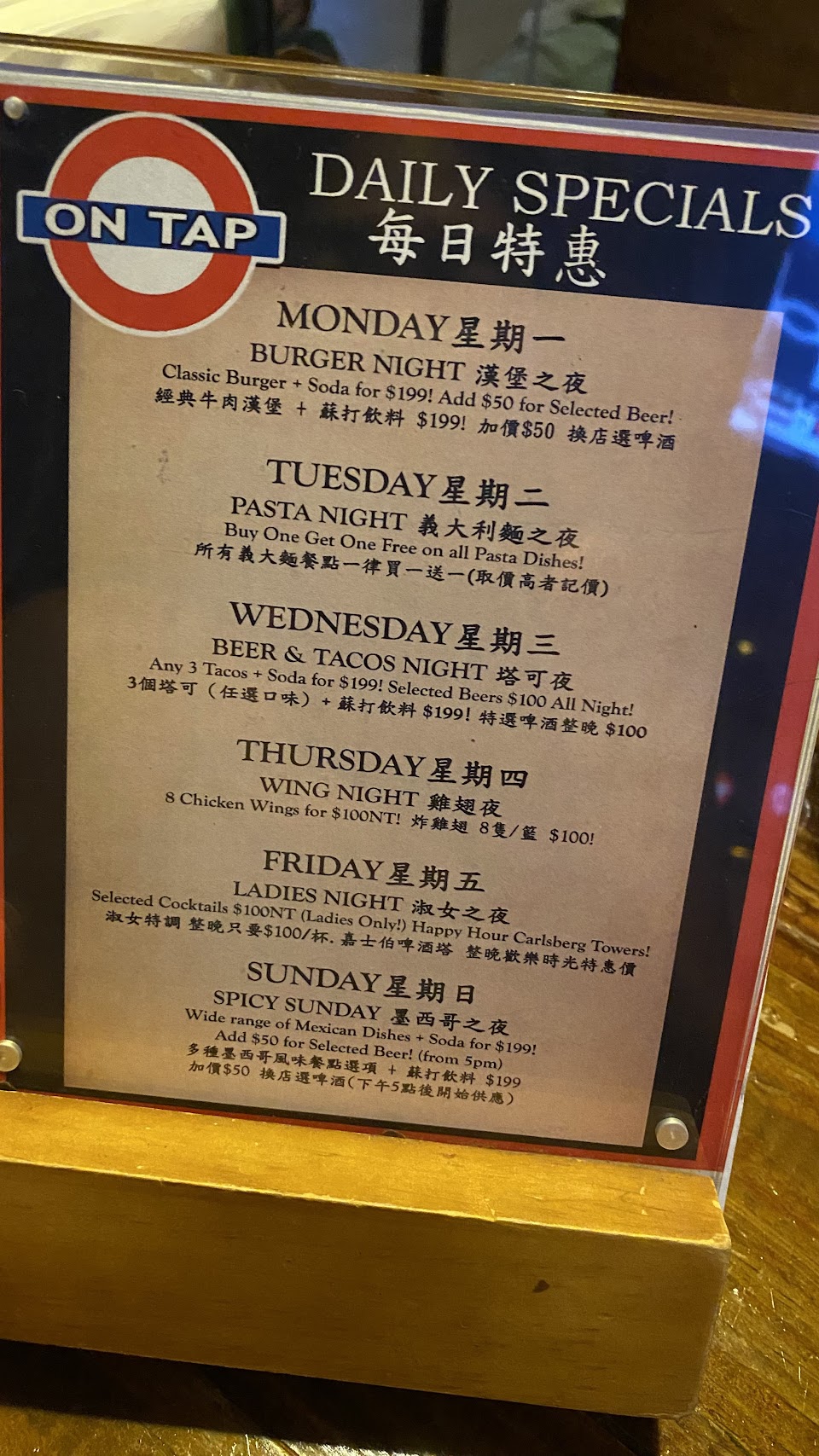 一間很英式的酒吧,酒類的選擇多,餐點味道不差,焗烤牛肉起士脆片、薄餅類還不錯,每天都有不一樣的餐點或酒類特價優惠,八點前有特定的酒類100元,很適合朋友聚會或單獨約會,電視都有球賽會轉播,地下室有撞球跟飛鏢可以玩,還有鋪克牌跟疊疊樂!!週五、六,一人低消是500