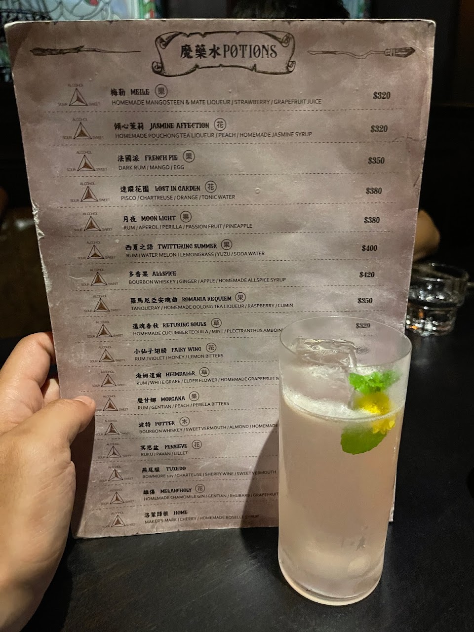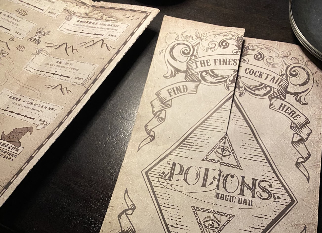 這次跟朋友一起去光顧,是一個非常棒的體驗,菜單、酒都很有特色,且都跟哈利波特有關,酒品的名字也是哈粉一看就懂的名字,酒單的設計也很有特色,是劫盜地圖,從兩側打開就是漂亮的地圖,上面是酒品的選項,以接骨木魔杖的顆粒位置代表酒的甜度,在地圖越上面的酒感越重,酒的味道也很不錯。另外要預訂才有的魔術表演,雖然我們是現場候位,服務人員卻還是給了我們一張魔術師召喚卡,魔術也非常精彩。如果背景音樂放的是古典或是玄幻一點的曲風,應該會讓人更融入這個魔法世界。整體而言是一級棒!